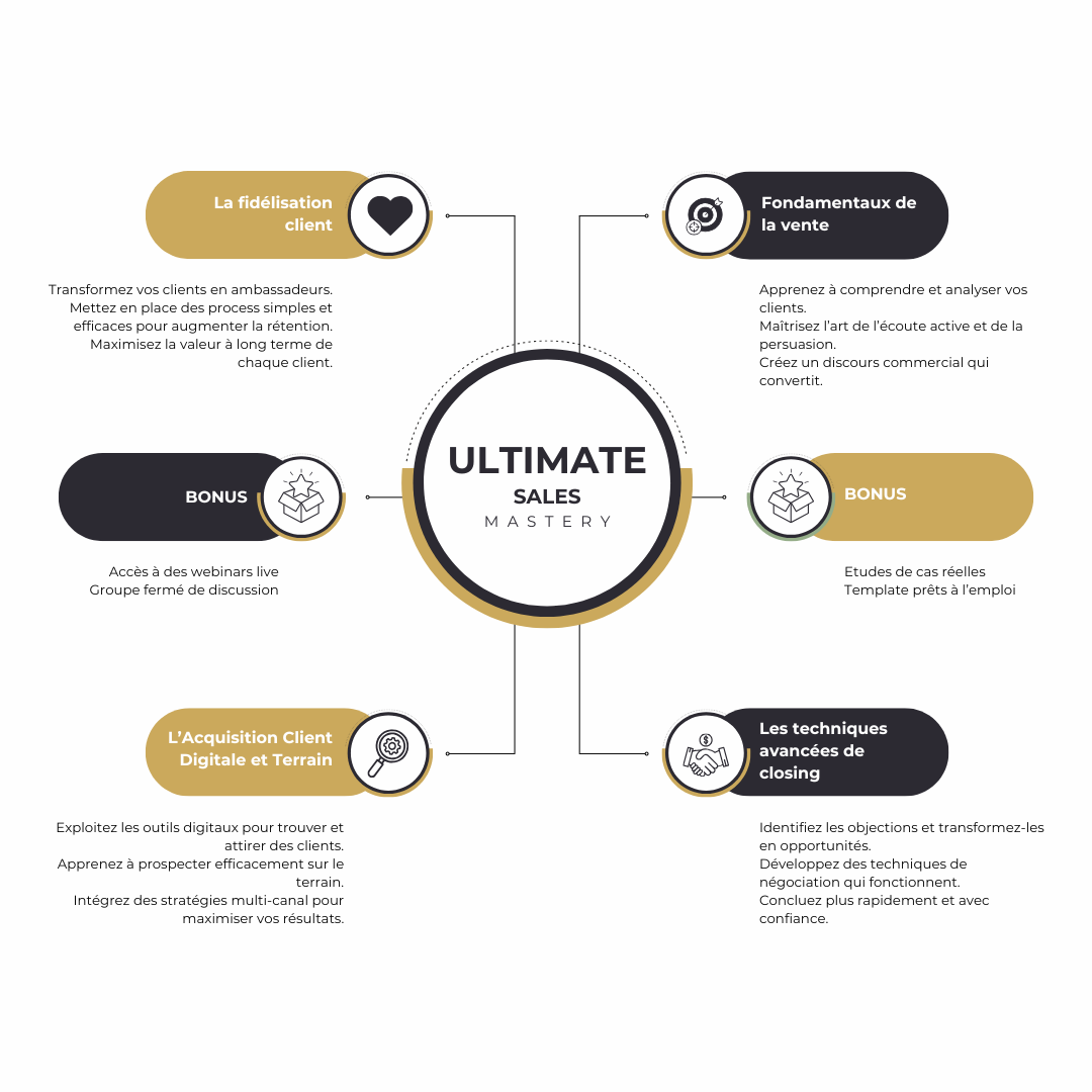 Que vous soyez débutant ou expert en ventes, Ultimate Sales Mastery est le programme incontournable pour tous les micro-entrepreneurs qui souhaitent optimiser leurs stratégies de vente et booster leur chiffre d’affaires de manière significative.